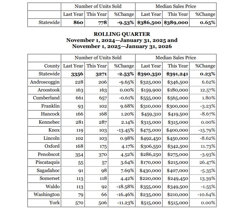 Below is a breakdown of numbers from the Maine Association of Realtors, including a three month rolling average for the state and each of the 16 counties.